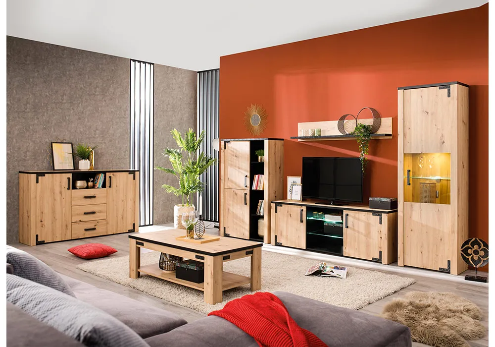 Il propose de multiples espaces de rangement, cachés ou vitrés, ainsi que des supports pratiques pour de belles décorations. Habillé de tons naturels, il séduit pour son côté chaleureux. La couleur bois s’accorde superbement pour insuffler un style industriel dans votre pièce de vie.