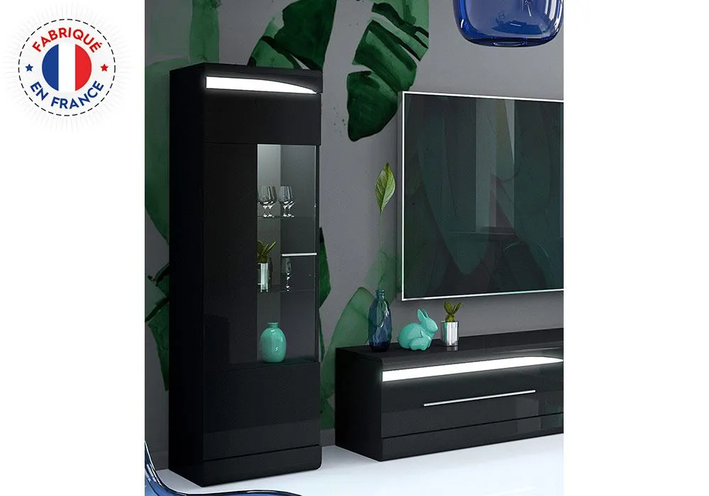 Le meuble vitrine noir 1 porte de la collection Ovio rendra votre intérieur contemporain et l’embellira par la couleur de ses façades qui se démarquent des autres vaisseliers standards. Cette vitrine design offre beaucoup d’espace de rangement. La vaisselle et tout autre ustensile de salle à manger trouveront place dans cette somptueuse vitrine design.